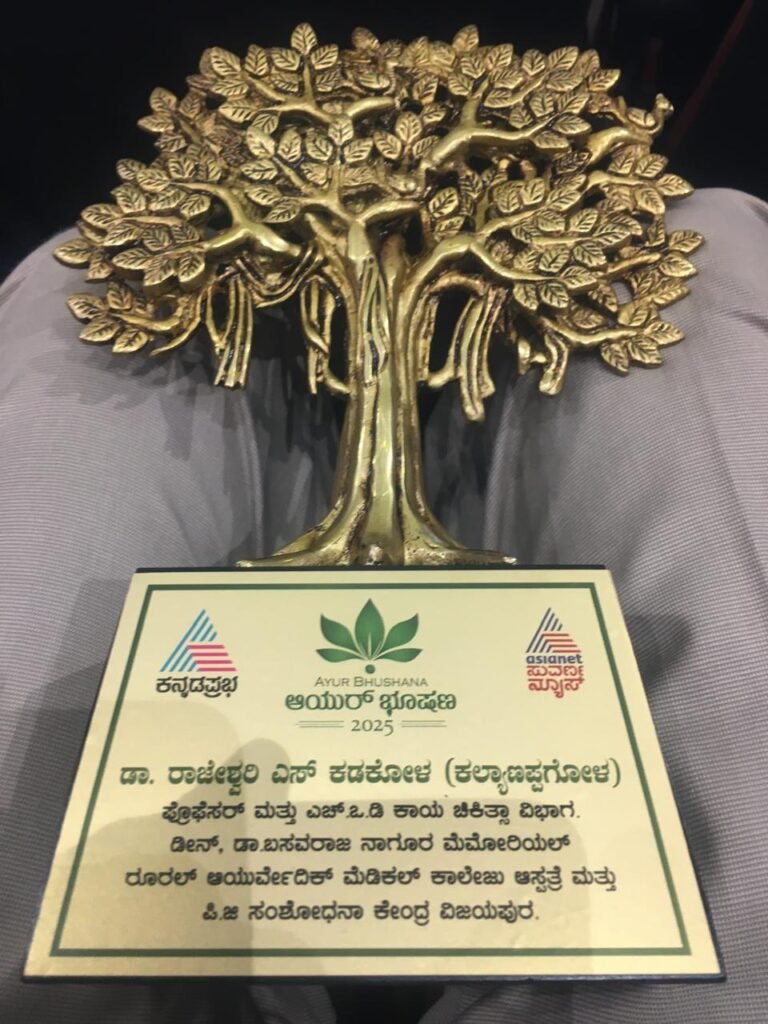 We are delighted to announce that Dr. Rajeshwari S. Kadakol, Professor, Department of PG Studies in Kayachikitsa, has been conferred the prestigious “Ayur Bhushana Award – 2025” in recognition of her outstanding contributions to Ayurveda education and research.